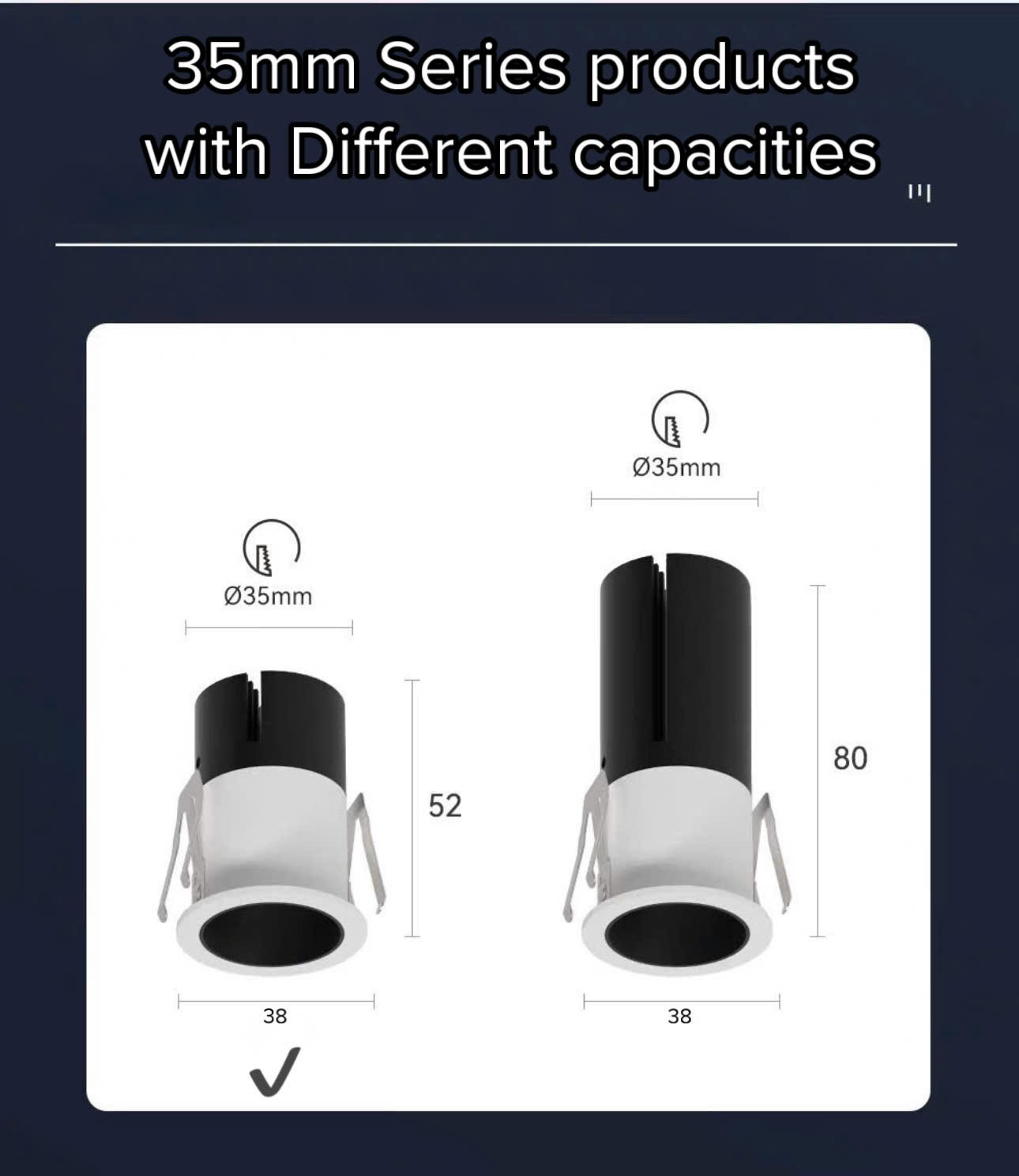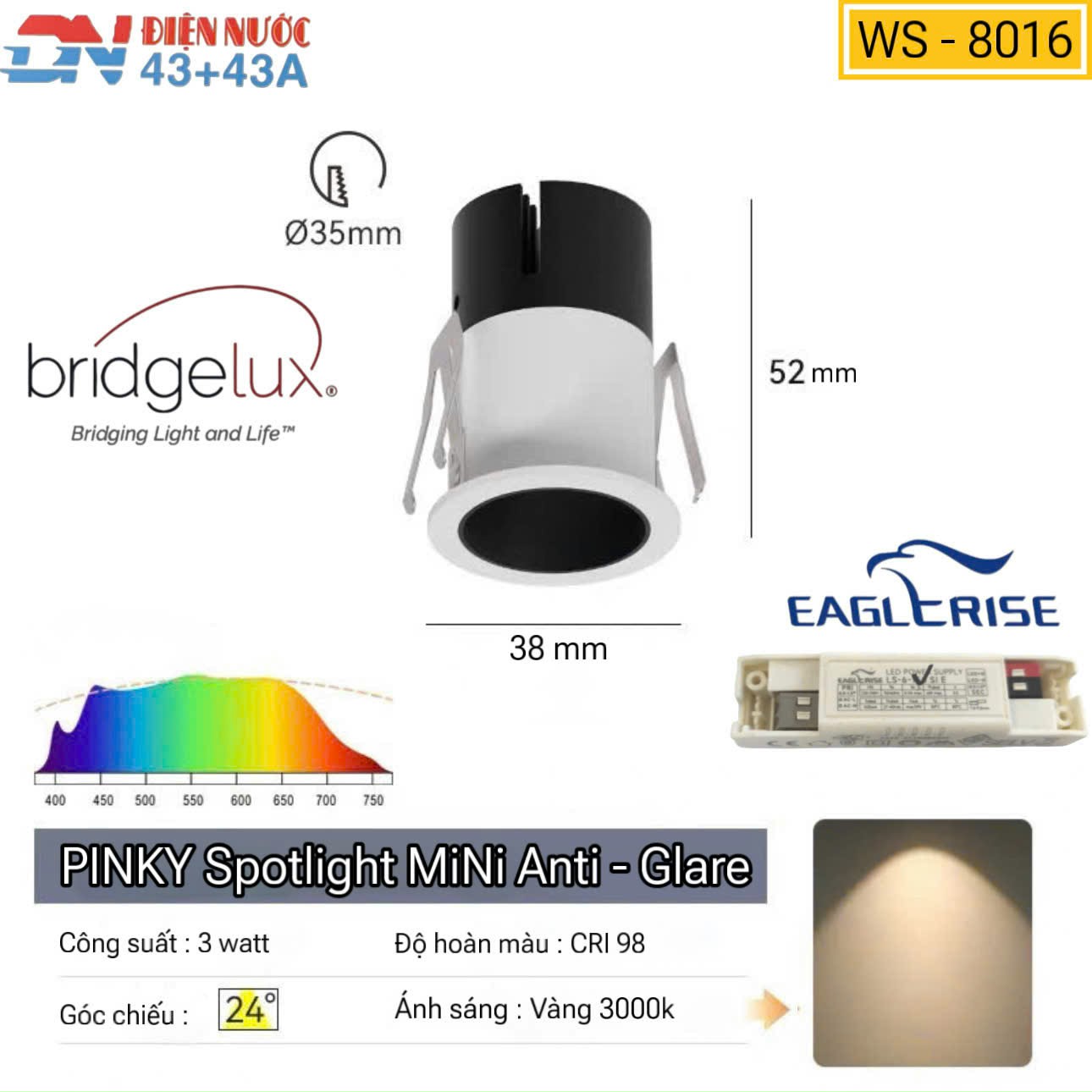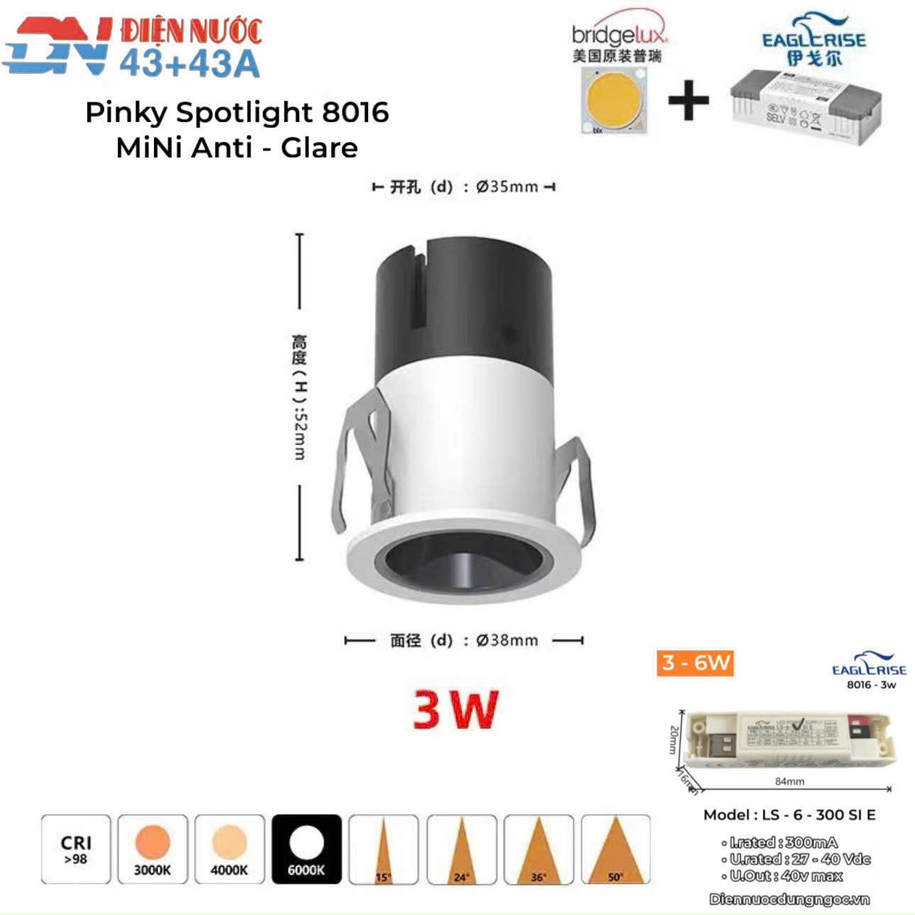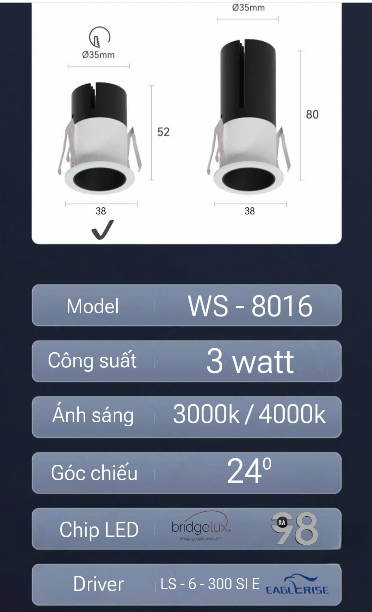 - KÍCH THƯỚC : Lỗ khoét : 35 mm - Mặt đèn : 38 mm - Chiều Cao : 52 mm